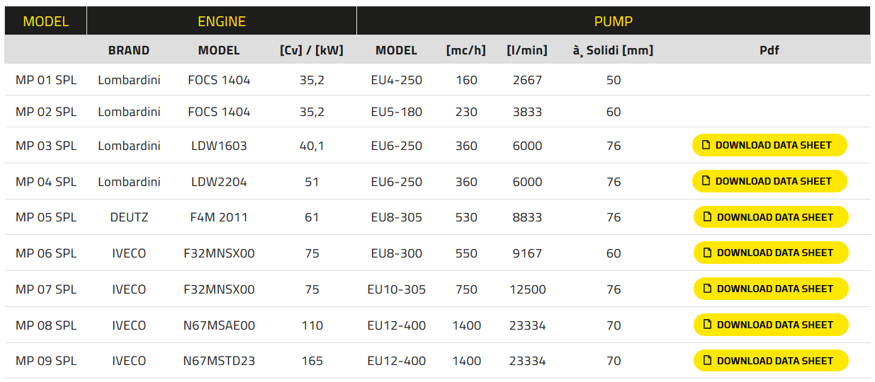 Saatavana IVECO FPT moottoreilla 73-350hv ja Variscon laippa- ja akselipumpuilla keskisuurille ja suurille virtausnopeuksille.